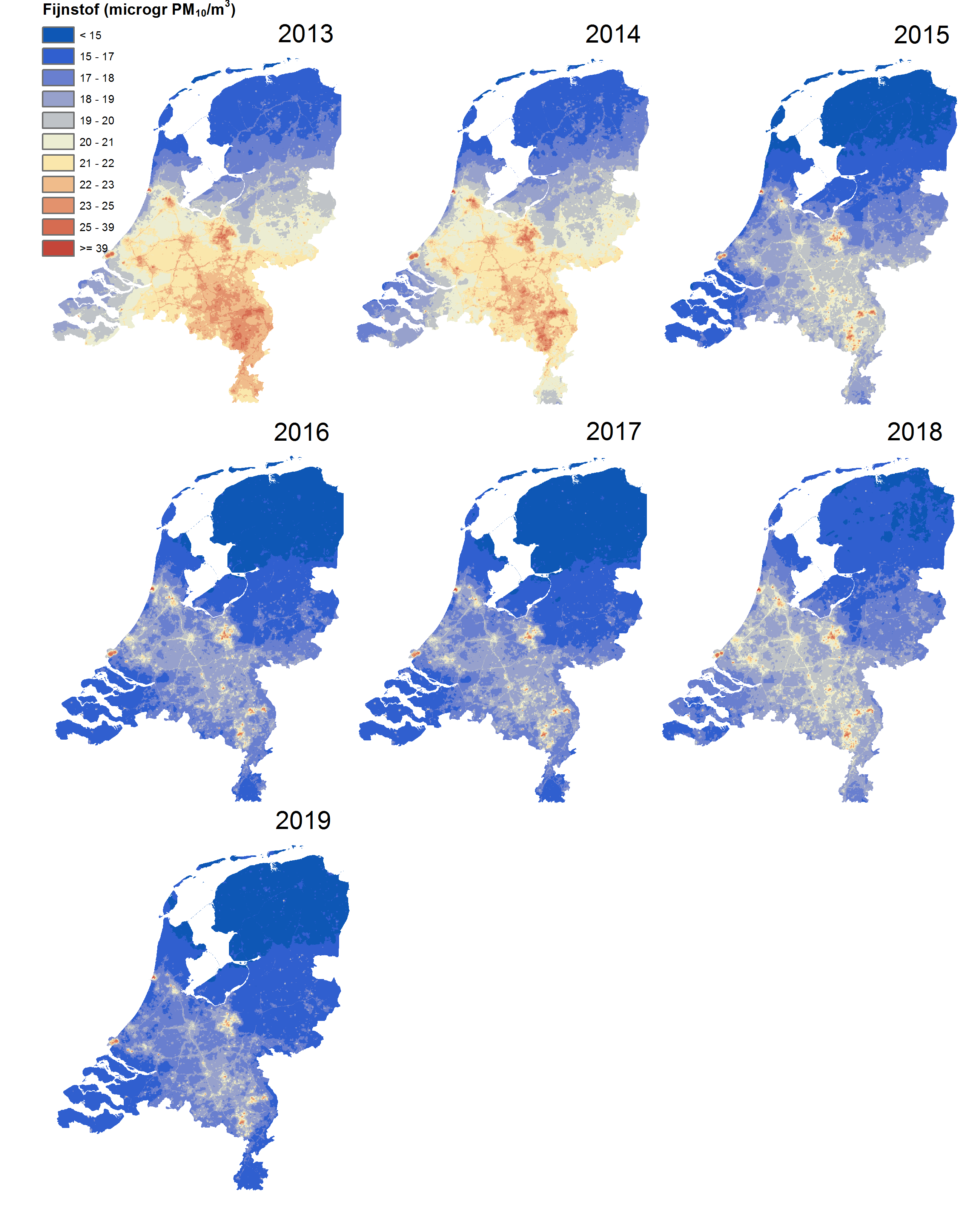 De kaarten van fijnstof tussen 2013 en 2019 laten zien dat de hoeveelheid fijnstof (PM10) in de lucht gedaald is. In 2013 en 2014 kleurden het midden en zuiden van het land nog geel tot oranje-rood. Met andere woorden, hier waren de concentraties hoger dan 21 µg/m3. Dit is hoger dan de WHO-advieswaarde voor PM10 van 20 µg/m3.